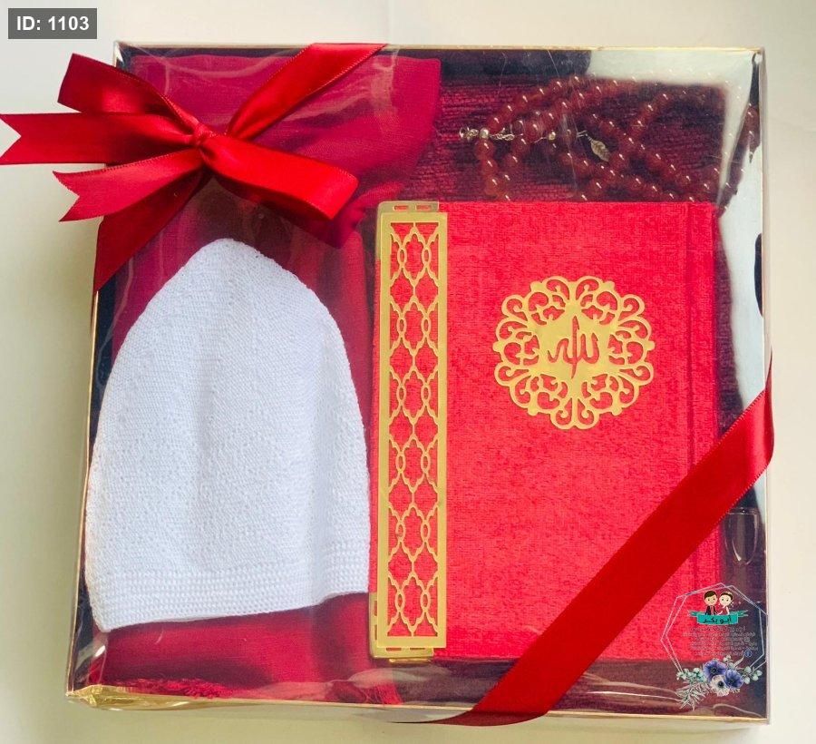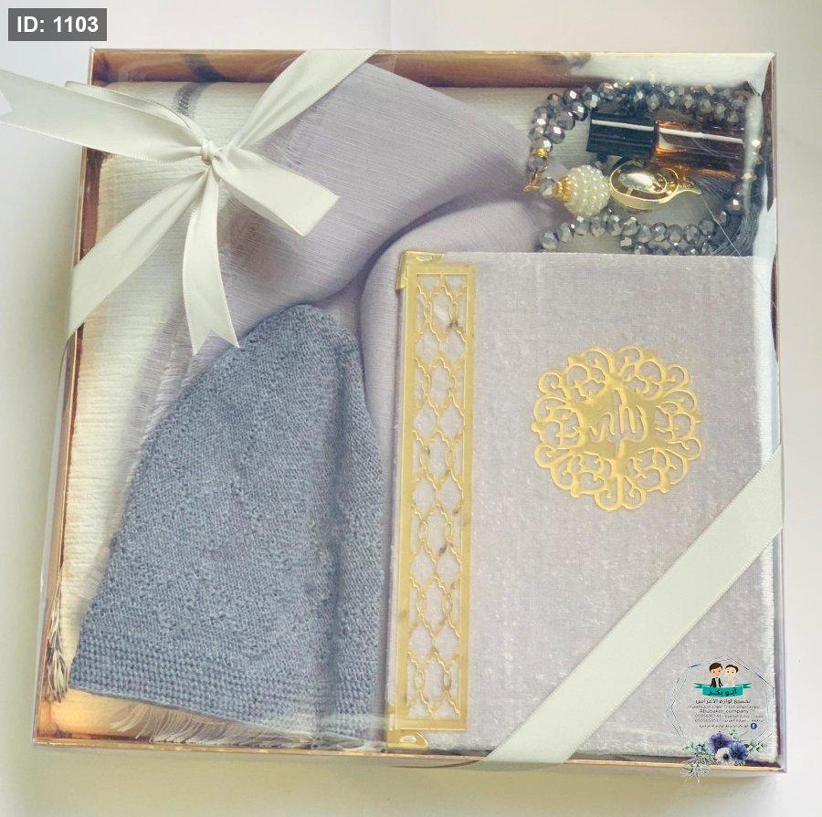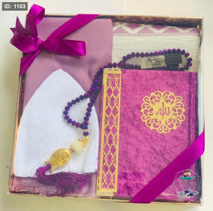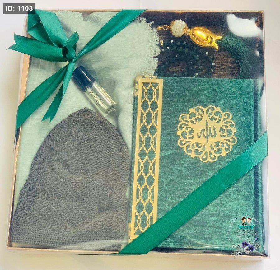 بكج قرءان مع مسبحة ومع سجادة صلاة وطاقية وعطر